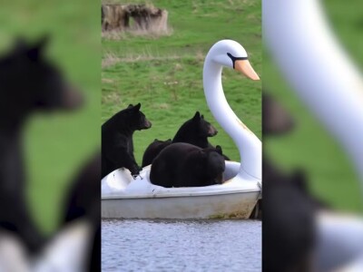 Heavy rainfall in Ridgmont, England formed a new “lake” in the North American black bears’ 13-acre enclosure at Woburn Safari Park. The carnivore keeper team gave the bears a swan boat to explore the lake. Keepers and visitors watched the bears set sail after they were lured to the boat by honey and monkey nuts.
