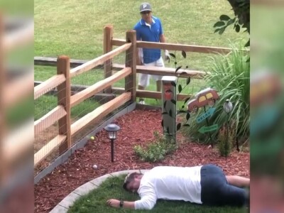 A man pretended to be hit by a golf ball in his backyard in Thornton, Colorado. When the golfer went to retrieve the ball he hit off the course, he noticed the man laying on the ground. The man got up and threw the golf ball back and walked off, leaving the confused golfer to continue his round.