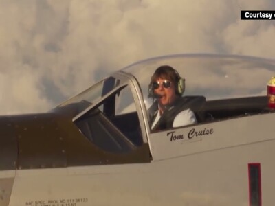 Actor Tom Cruise accepted the award for best performance for his role in 'Top Gun: Maverick' while flying a plane.