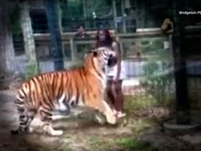 Woman jumps fence to pet a tiger