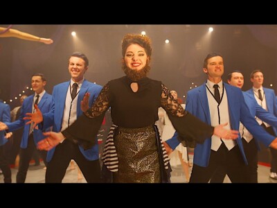 Aerialist Darla Davis sings with Vocal Point member Jason Bromley in Vocal Point's newest music video, an a cappella mashup of songs from 'The Greatest Showman.' (BYU Vocal Point)